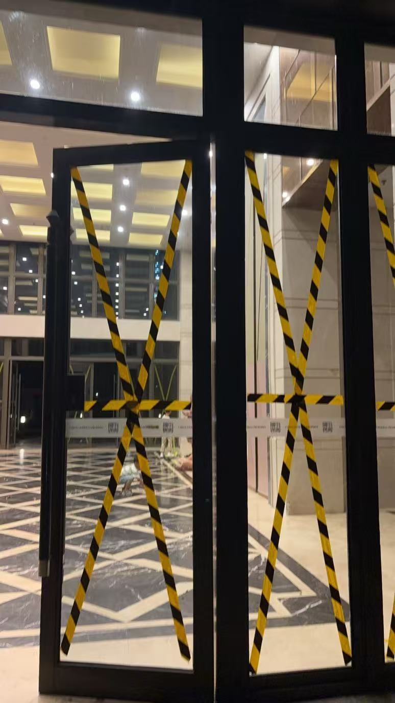 陈向前所居住的小区,物业提前给大堂玻璃贴上了“米字胶带”。